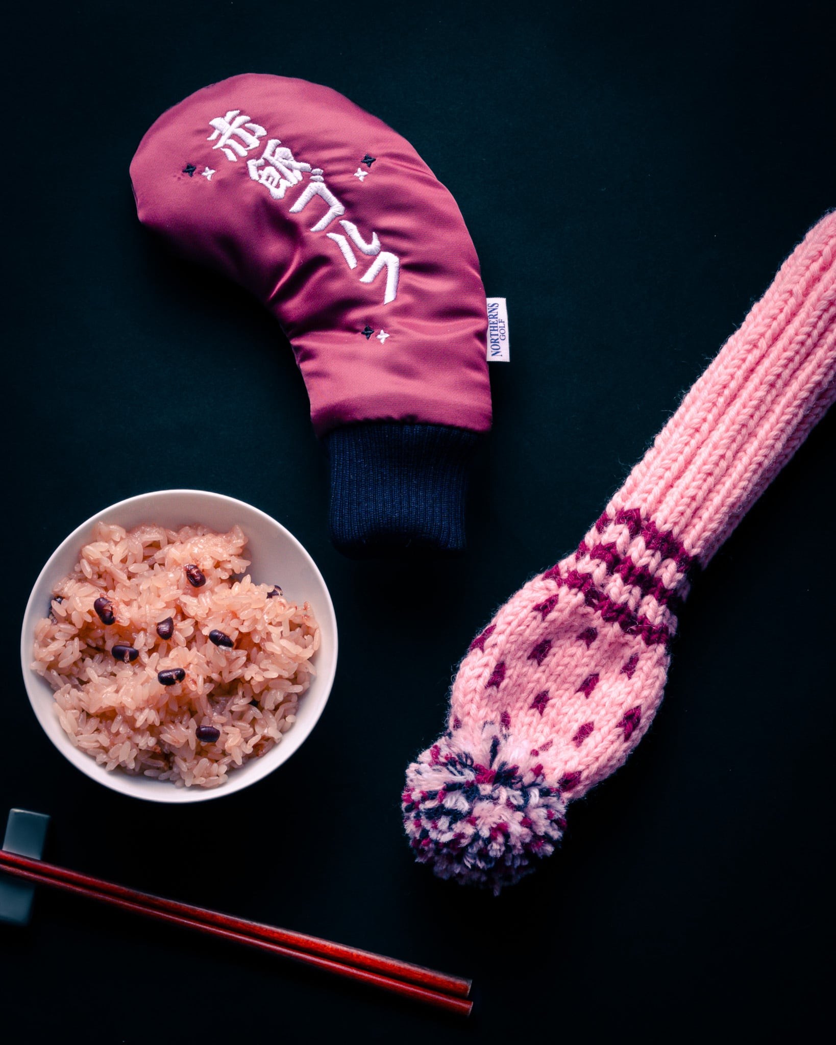This is a prototype iron cover from our “MA-1 RIB” line, featuring a special embroidered design. The embroidery reads “Sekihan Golf” in Japanese. According to our own small survey, there are a few golfers in Japan who have a quiet routine before their round: they always buy a sekihan onigiri — a rice ball made with red beans. Sekihan is a traditional Japanese food often enjoyed on celebratory days, and some golfers treat it as their personal source of energy!