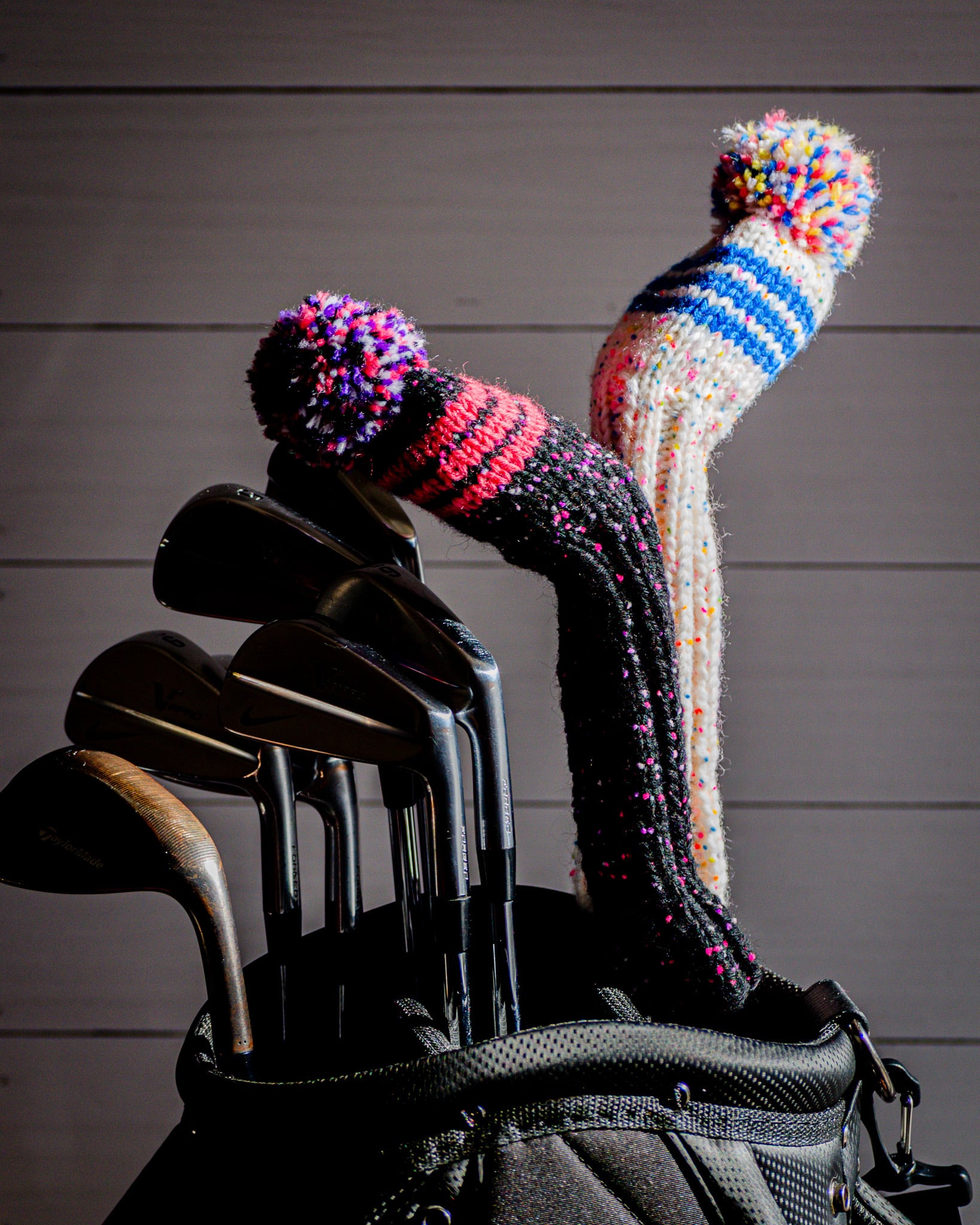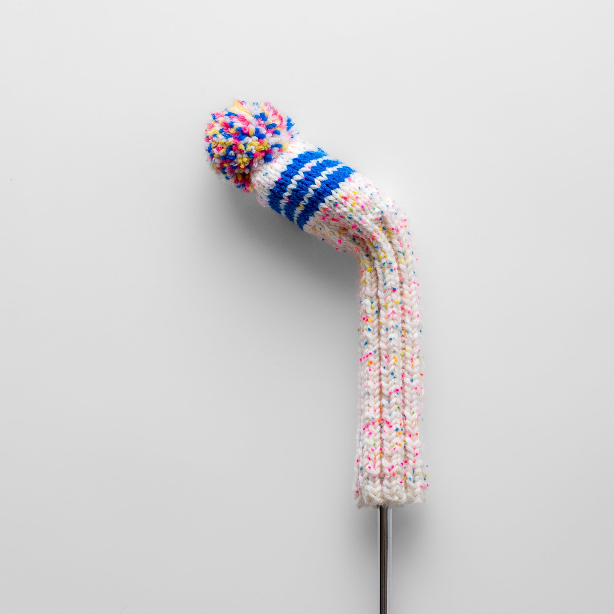 ウールをベースに独自にブレンドした糸を使い、手編みで仕上げたヘッドカバーです。ハイブリッドクラブ向けに設計しており、ティーショットから林の中でのショットまで、幅広い場面で扱いやすい形にまとめています。コンパクトなサイズで取り回しがよく、ポンポンも小さめのため、他のクラブと並べて収めても干渉しにくいのが特徴です。