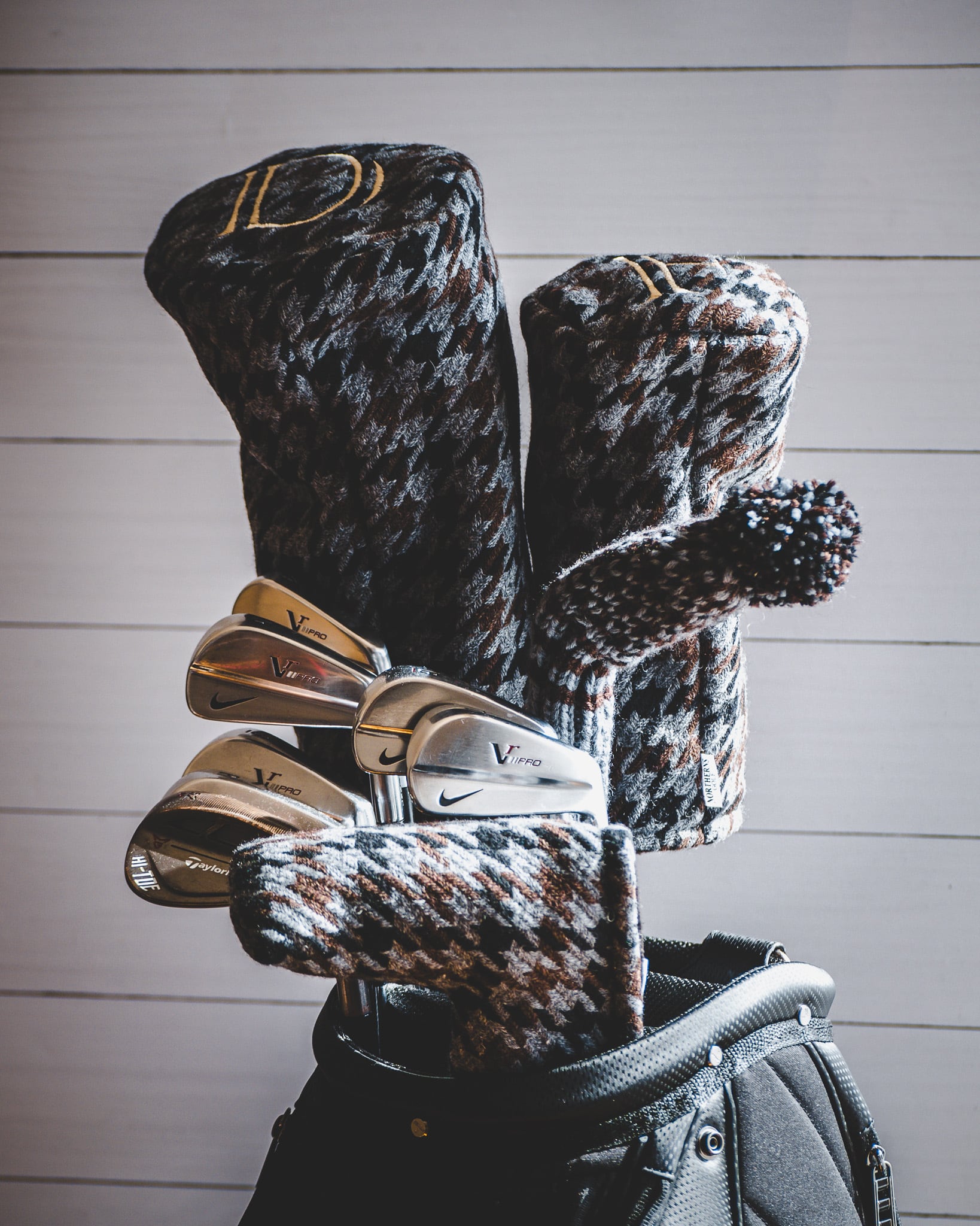 同じシリーズのパターカバーや、同じ柄で手編みした毛糸のヘッドカバーと合わせれば、キャディバッグ全体が落ち着いた統一感のある雰囲気にまとまります。上質なコーディネートを楽しみたいゴルファーの皆さまにもおすすめです。