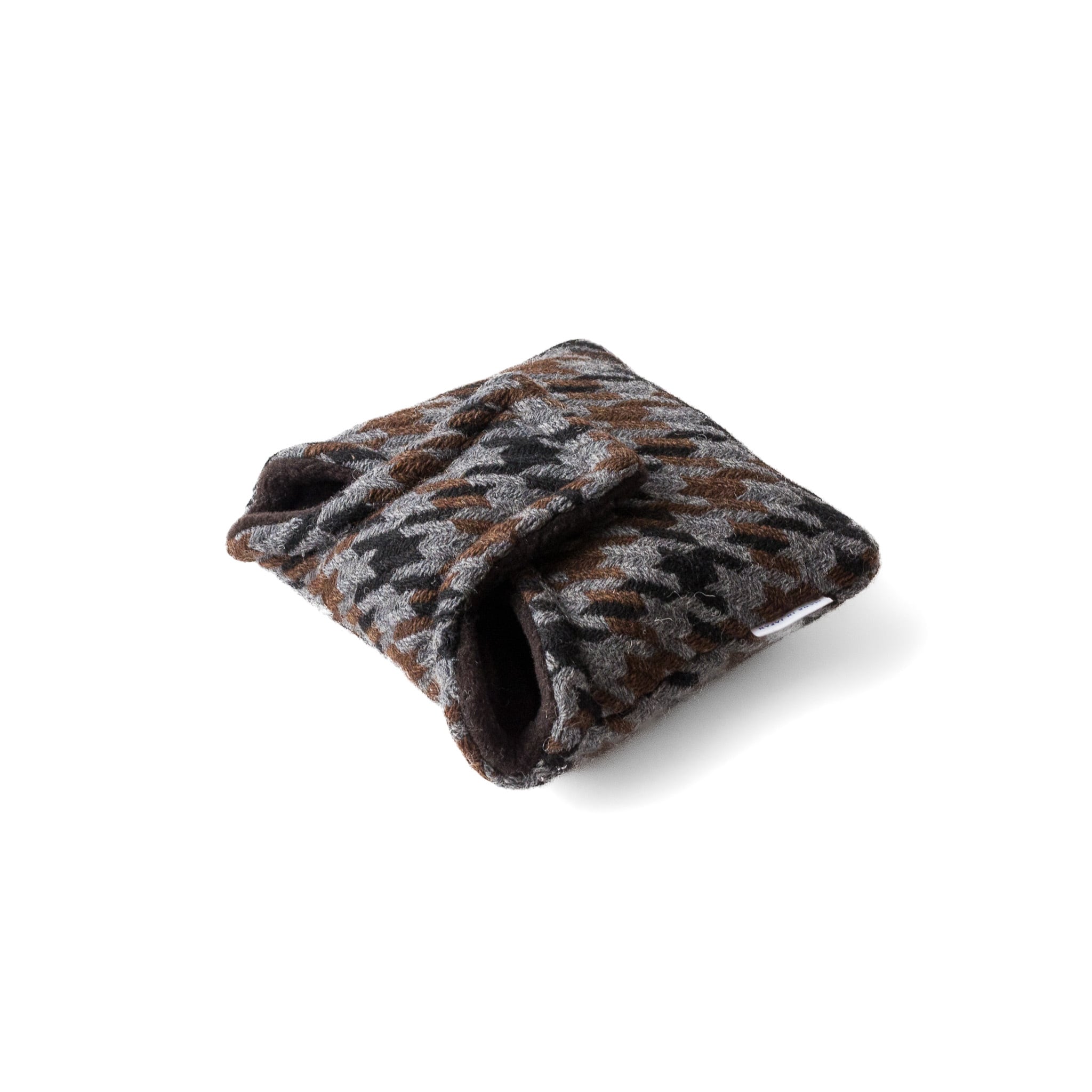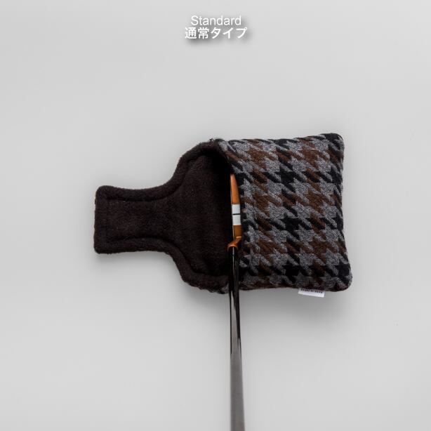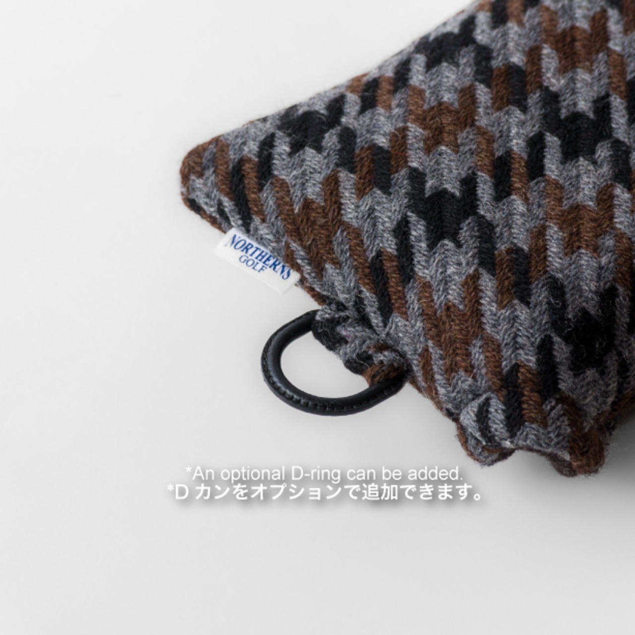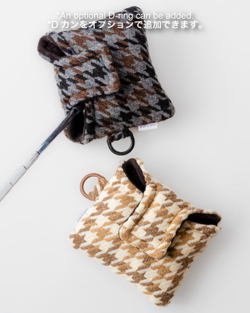 This putter cover is made from a tri-color houndstooth tweed woven in the Bishu region, a well-known wool area in Japan. The fabric has a soft feel with a light, airy texture, and the calm color mix gives it a classic and grown-up look.