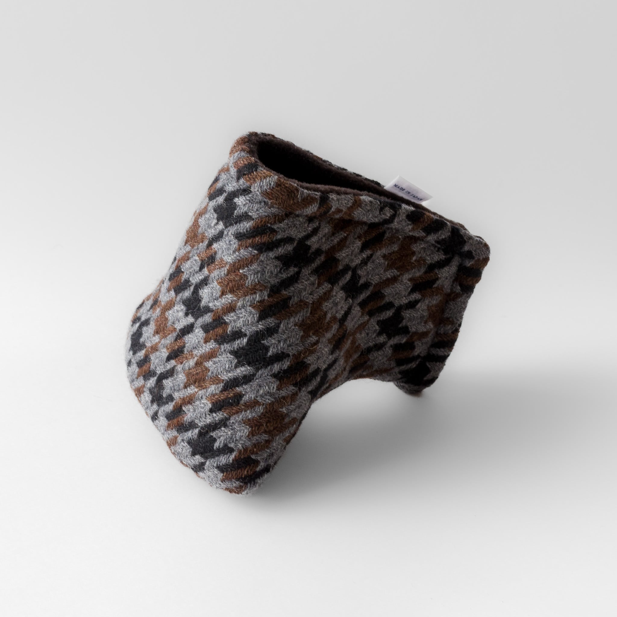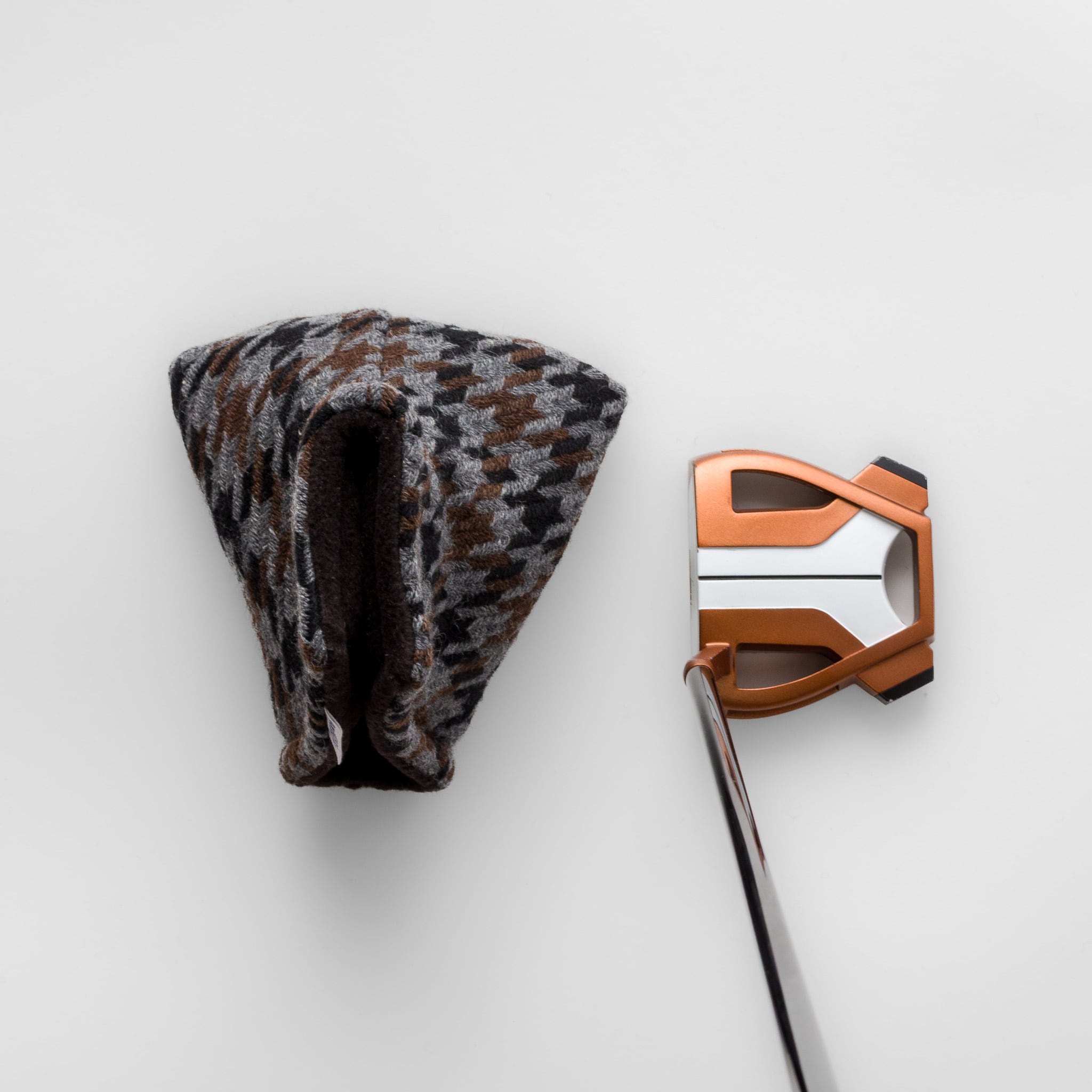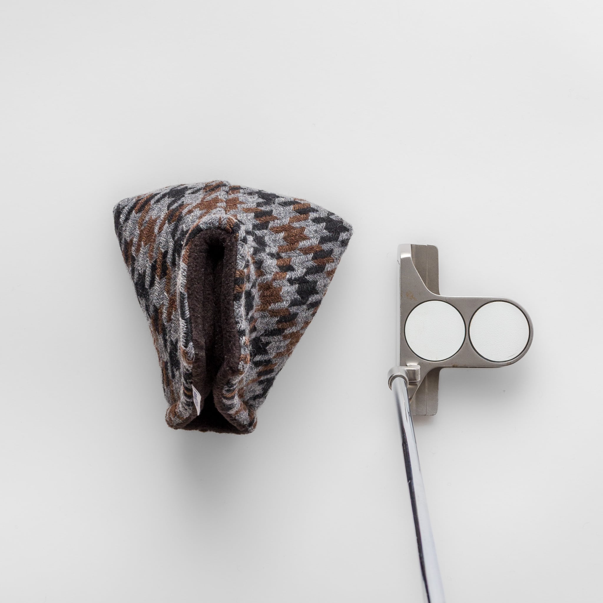 日本のウール産地として知られる尾州で織られた、三色の千鳥格子ツイードを使用したパターカバーです。マレットタイプでもネック(ホーゼル)をしっかり保護できるよう、ブレード用パターカバーのスタイルで、マレット用にサイズを調整し製作いたしました。パターを大切にされているお客様にぜひご使用いただきたいカバーです。