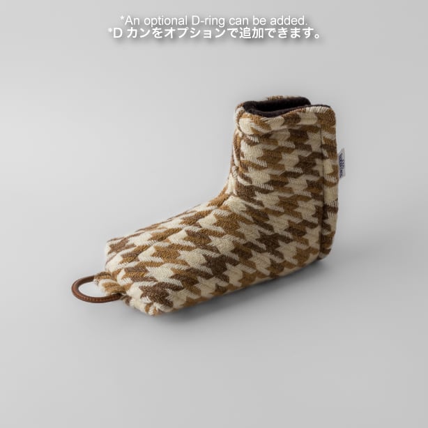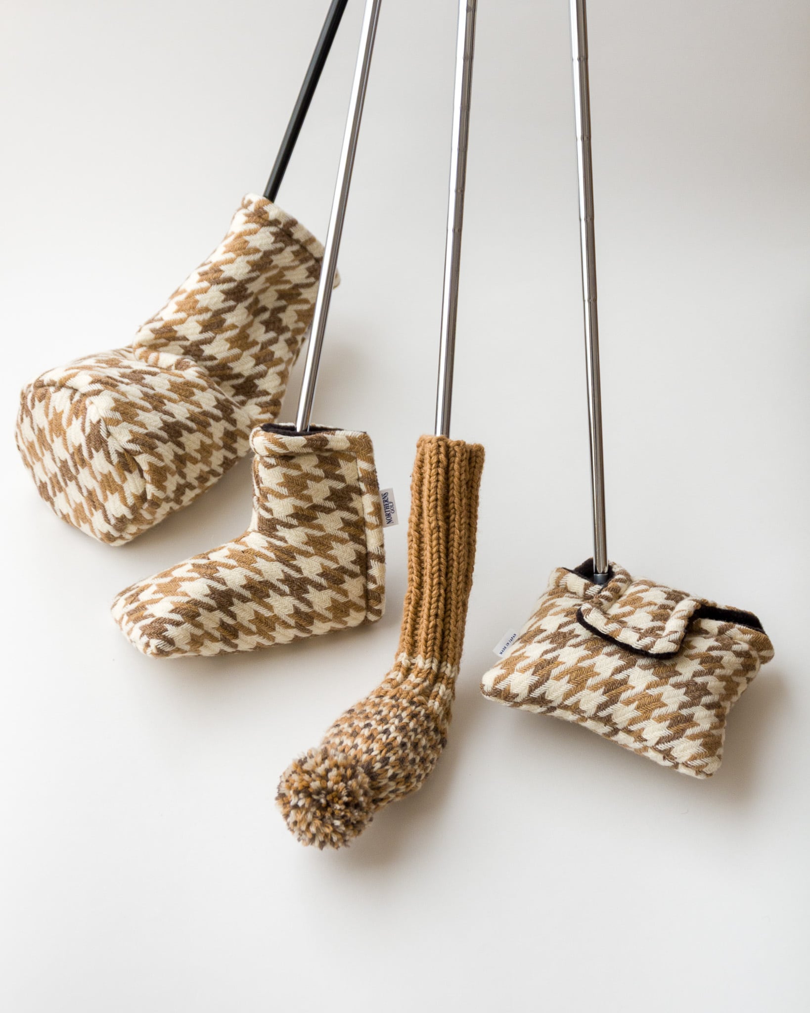 This putter cover is made from a tri-color houndstooth tweed woven in the Bishu region, a well-known wool area in Japan. The fabric has a soft feel with a light, airy texture, and the calm color mix gives it a classic and grown-up look.