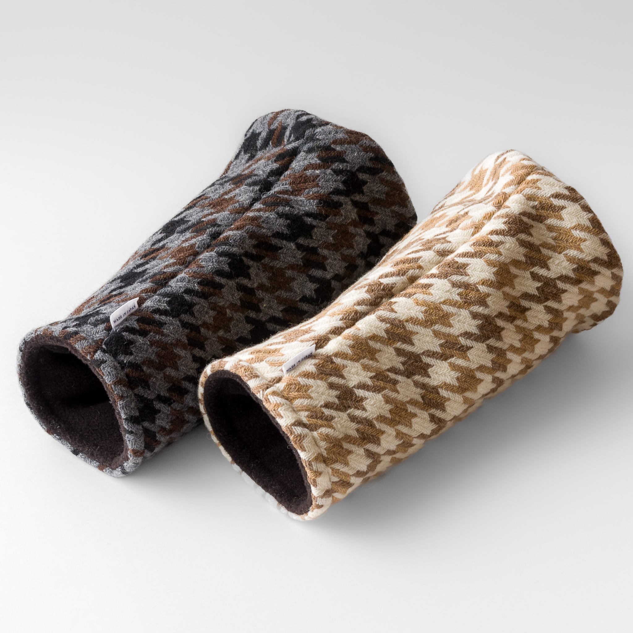 日本のウール産地として知られる尾州で織られた、三色の千鳥格子ツイードを使用したヘッドカバーです。やわらかく空気を含んだような質感と穏やかな色合いが特徴で、大人らしい上品な佇まいに仕立てました。