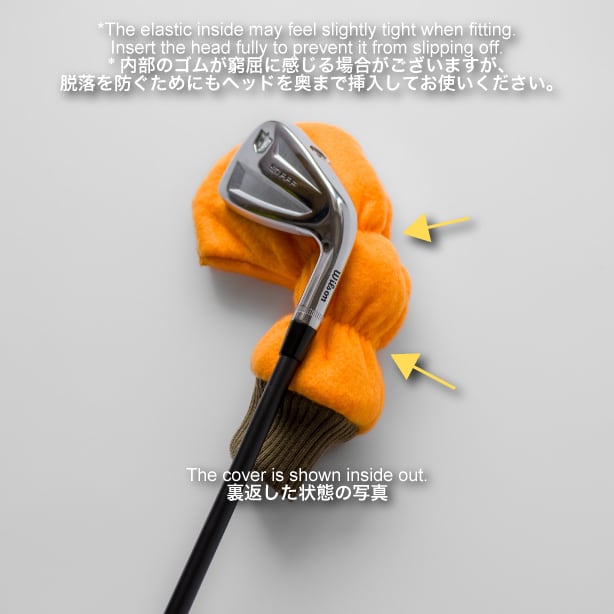 MA-1フライトジャケットからインスパイアされたヘッドカバーです。裏地には柔らかいフリースを採用し、クラブヘッドを傷から守ります。ゴムの絞りに加えて挿入口にリブニットを取り付けることで、クラブが抜け落ちにくくなるように工夫しています。撥水性のあるナイロン生地なので、雨の日のゴルフでも安心です。