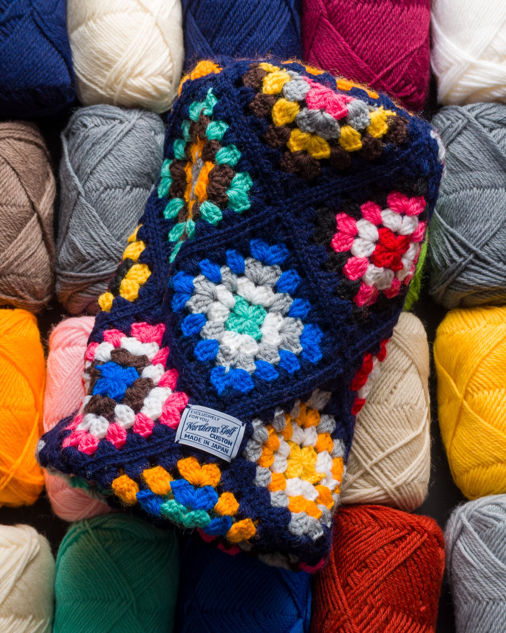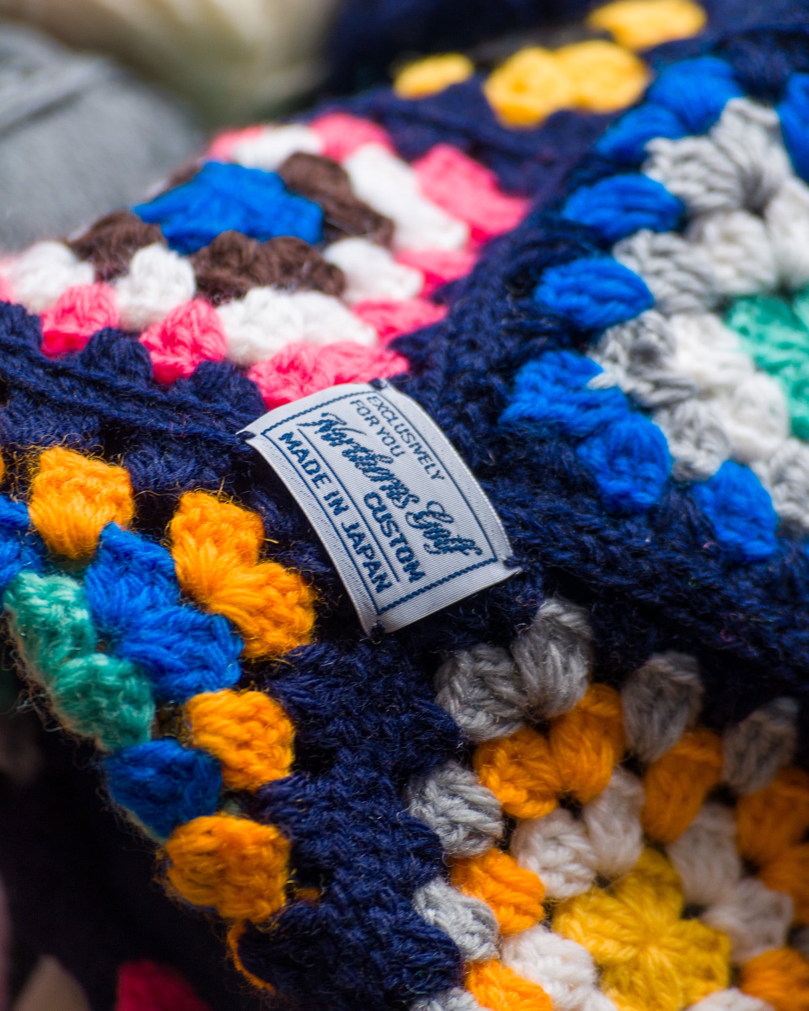 グラニースクエアと呼ばれる伝統的な手編み技法を用い、一枚ずつ編んだモチーフをタイルのようにつなぎ合わせて形作りました。