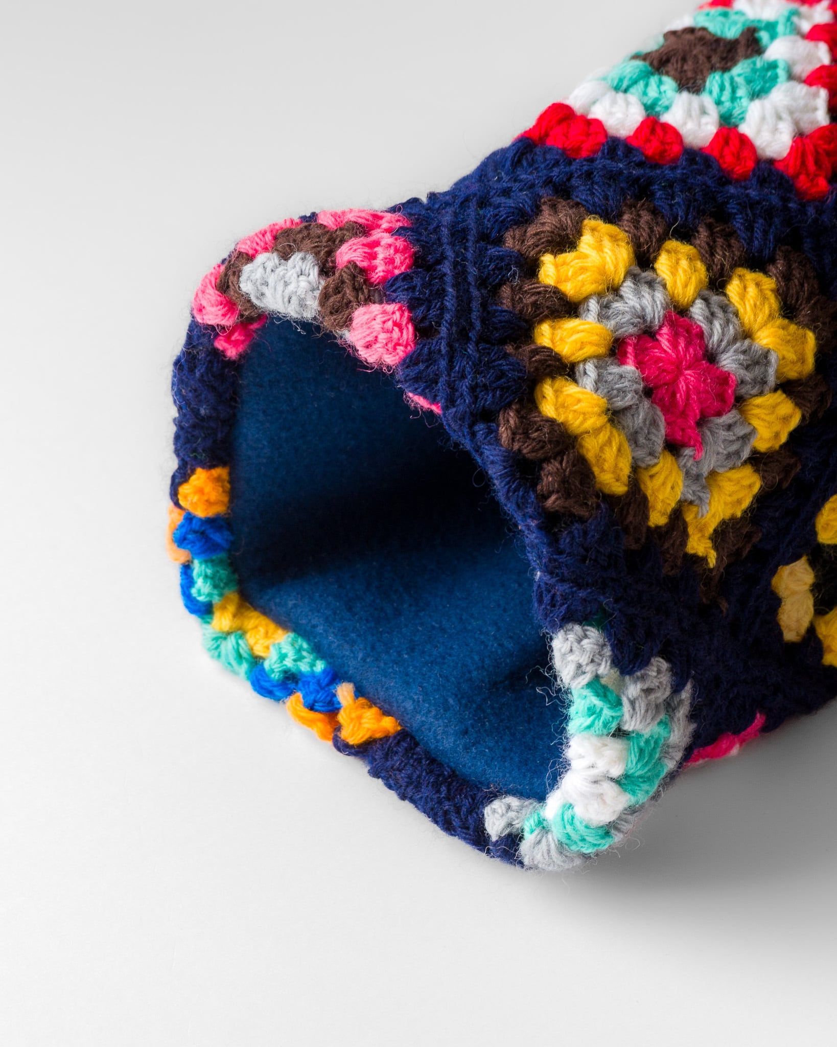 - Barrel shape made with hand-knitted granny squares