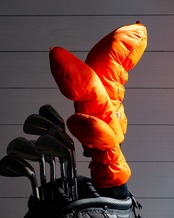 MA-1フライトジャケットからインスパイアされたヘッドカバーです。裏地には柔らかいフリースを採用し、クラブヘッドを傷から守ります。ゴムの絞りに加えて挿入口にリブニットを取り付けることで、クラブが抜け落ちにくくなるように工夫しています。撥水性のあるナイロン生地なので、雨の日のゴルフでも安心です。