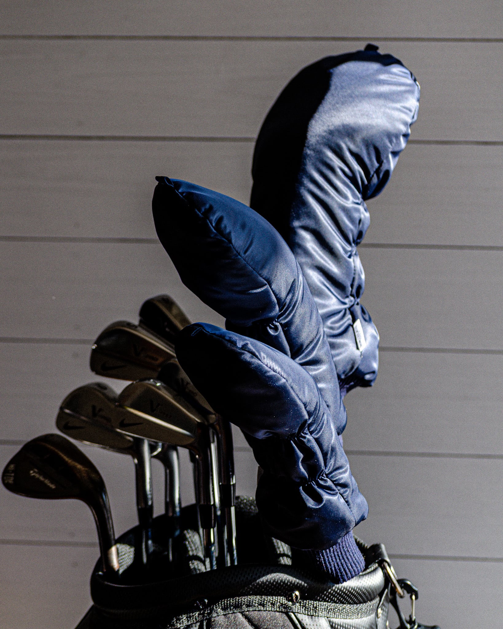 MA-1フライトジャケットからインスパイアされたヘッドカバーです。裏地には柔らかいフリースを採用し、クラブヘッドを傷から守ります。ゴムの絞りに加えて挿入口にリブニットを取り付けることで、クラブが抜け落ちにくくなるように工夫しています。撥水性のあるナイロン生地なので、雨の日のゴルフでも安心です。
