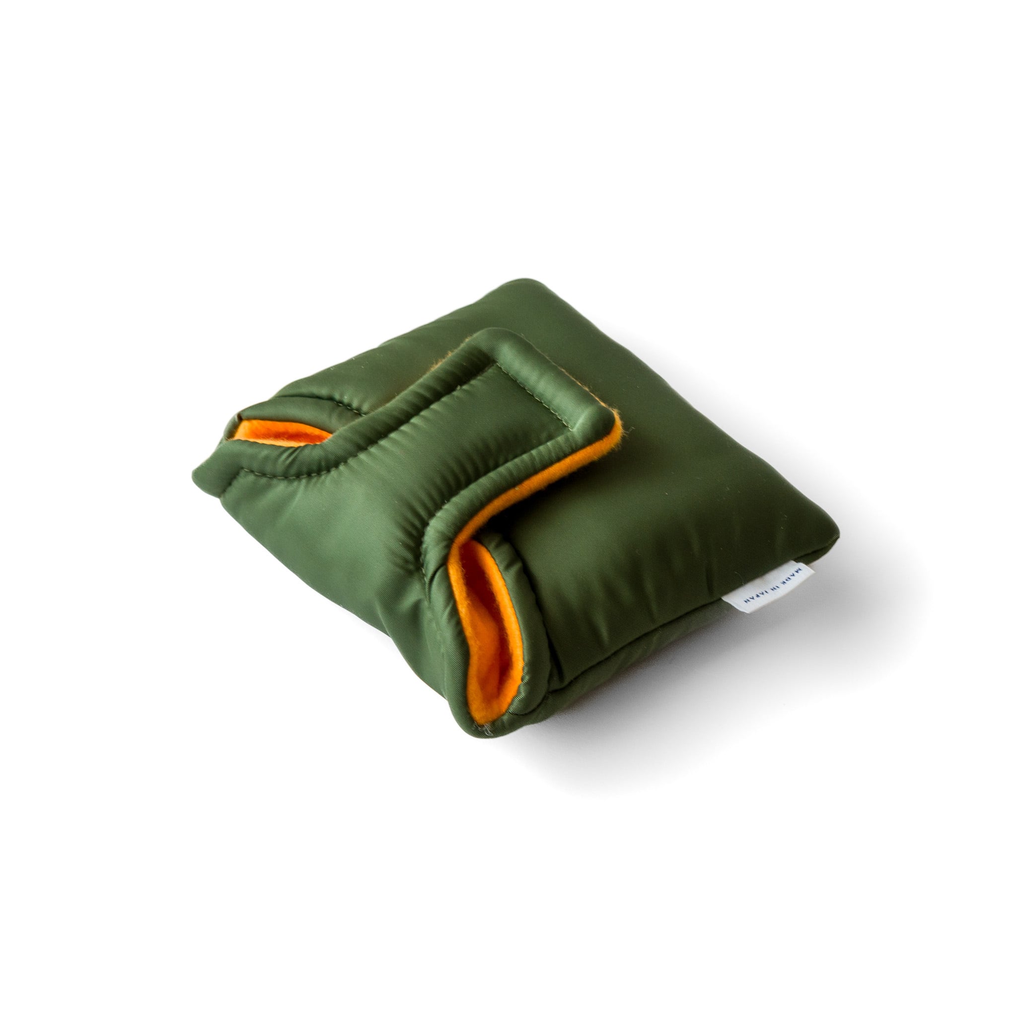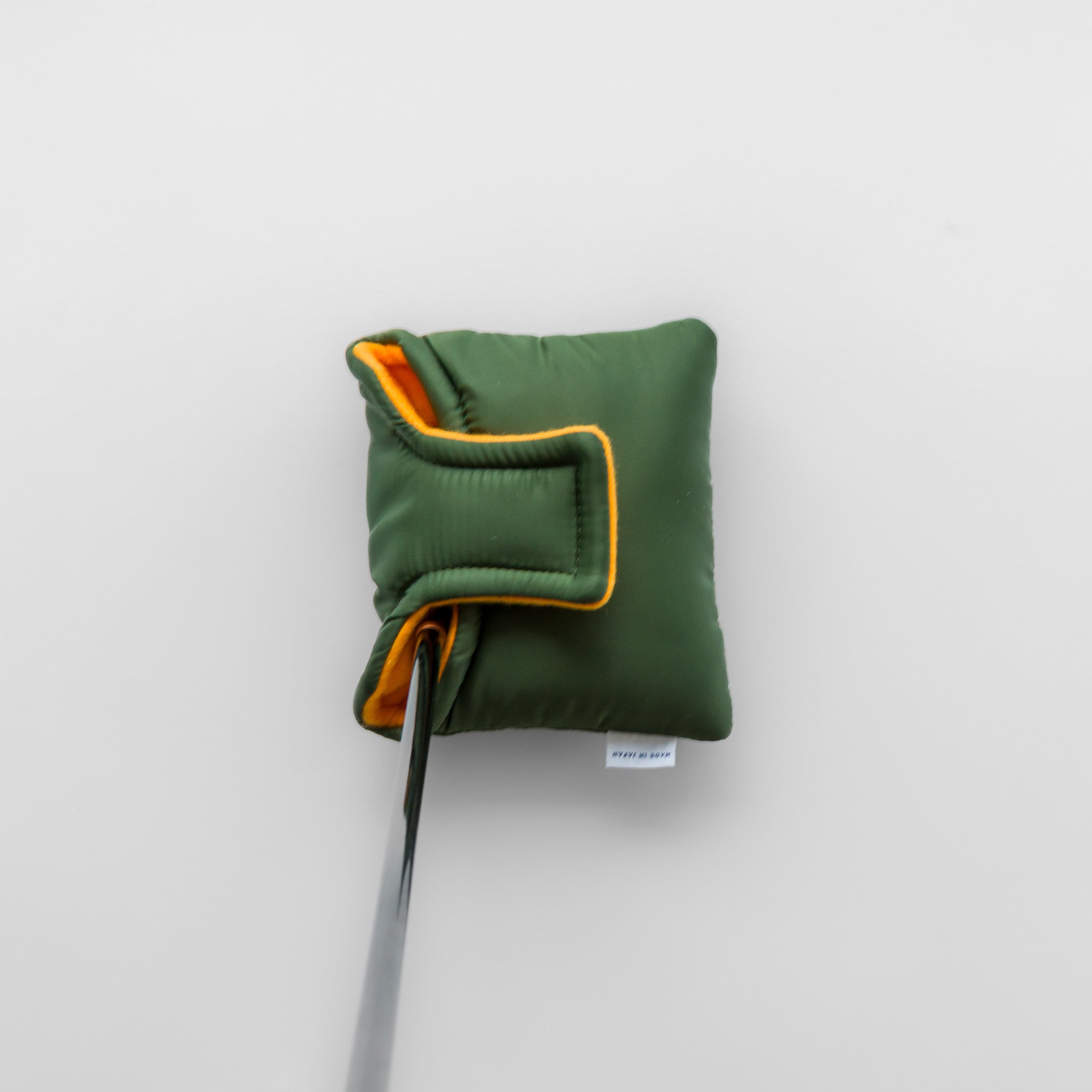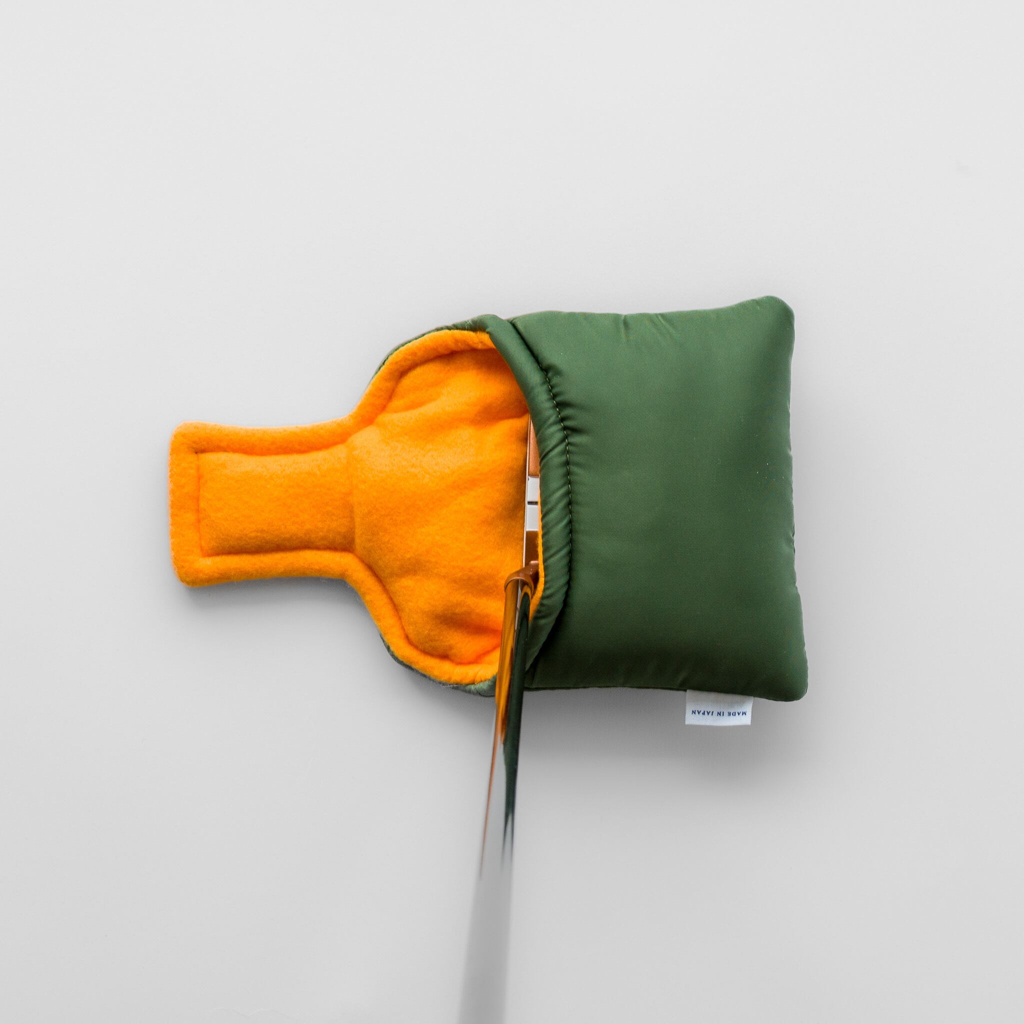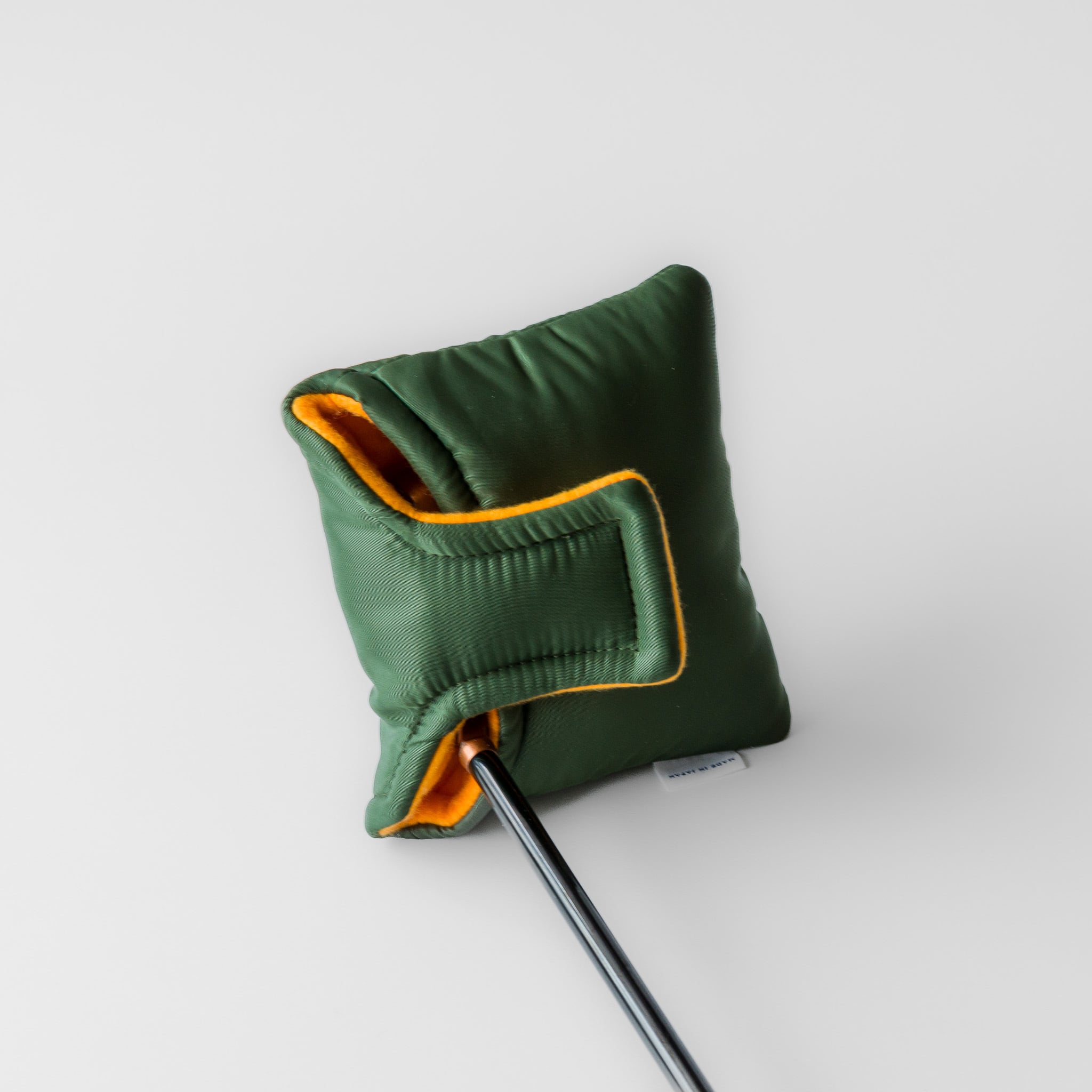 MA-1フライトジャケットから着想を得たパターカバーです。特性の異なる複数のクッション材を重ねた構造により、保護性と包み心地を両立しました。しっかりと厚みがあり、手にしたときにも安心感のある仕上がりです。開閉部には扱いやすいマグネットを採用。スクエアな形状は、大ぶりなマレット型ヘッドにもフィットします。